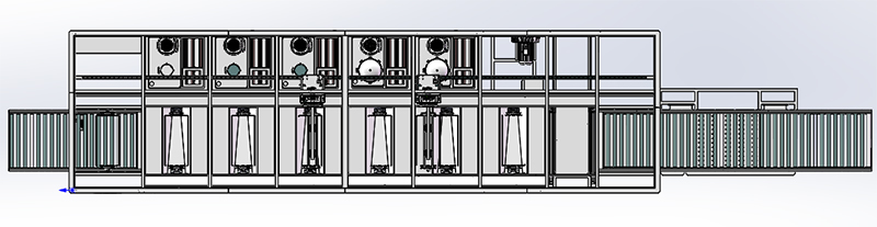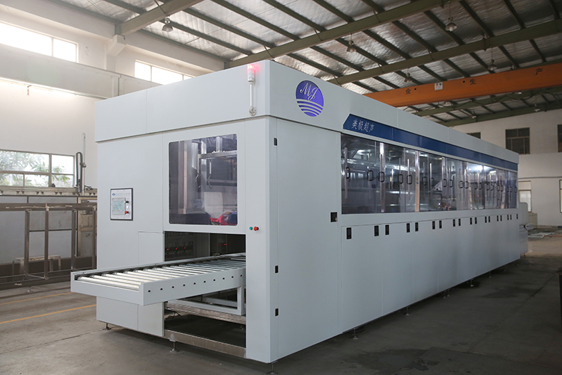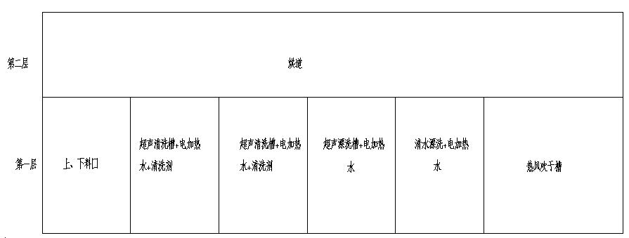 進料→超聲粗洗(超聲波+電加熱)→超聲精洗(超聲波+電加熱)→超聲漂洗(超聲波+電加熱)→清水漂洗(循環過濾+電加熱)→熱風吹干→烘道烘干→出料